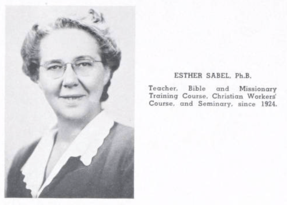 No Bethel woman is featured in any of the brief hagiographies (“saints’ stories”) that serve as a key storytelling device for Adolf Olson’s Centenary History. But Seventy-Five Years does include a brief biography of Esther Sabel. An honors graduate of the University of Chicago, Sabel studied briefly at Moody Bible Institute and Newton (MA) Theological Institution before coming to western Minnesota in 1922 to serve as English teacher and principal of the high school in tiny Parkers Prairie. In 1924, Bethel hired her to teach in its new Bible and Missionary Training School (BMTS), a two-year course (later halved in length) that “served a very distinct purpose in educating young men and women for more effective service on the home and foreign field” as missionaries and Christian education workers (Seventy-Five Years, 56). The Olsons praised Sabel, who taught at Bethel until her retirement in 1958, as”a very efficient and loyal member of the Bethel faculty” (57).