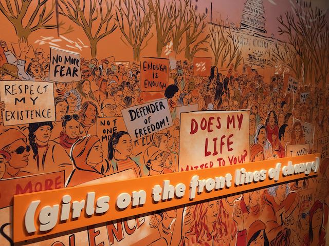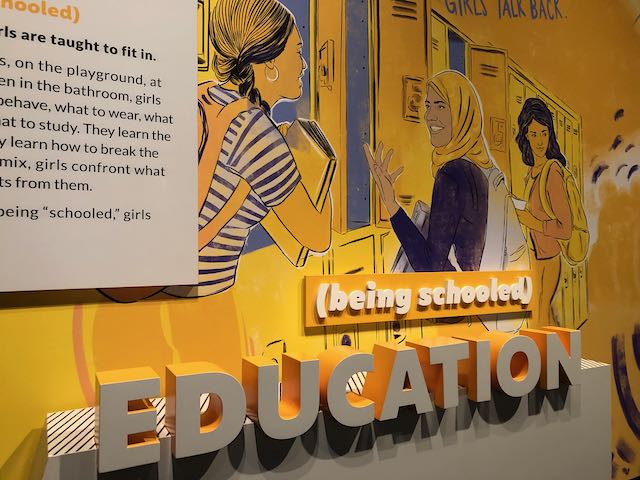 Created in 2020 by the National Museum of American History and still traveling to different historical museums around the country, Girlhood (It’s complicated) “engages audiences in timely conversations about women’s history and women’s issues through unexpected stories of girlhood in the United States.” As a short video near the start of the exhibit explains, the 100th anniversary of the 19th Amendment inspired the exhibit’s designers to ask questions like, “Who gets to decide what it means to be a girl?” and “How does girlhood make people political?” (or even “stretch our imagination of what’s political”).