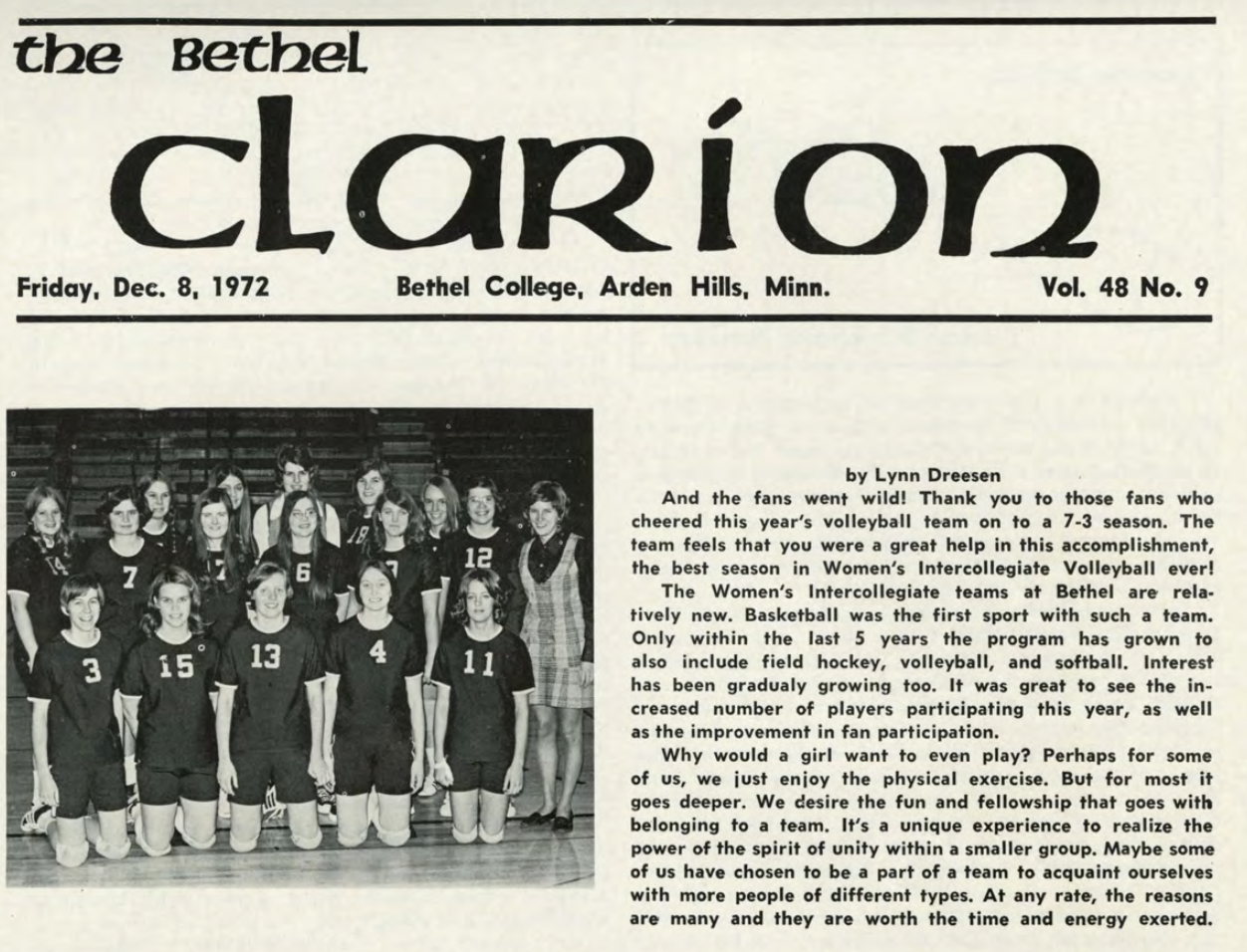 For the sake of time, I won’t go all the way back to the student newspaper’s origin in 1921. But even starting with the nine issues digitized from the year the College relocated to Arden Hills, you can get some sense of the potential — and problems — with student newspapers as a type of historical evidence. For example, the 1972-73 run of The Clarion debated dating culture on campus after Nik Dag, the fall event to which Bethel women traditionally invited men (“Thank goodness the sex roles are exchanged only once a year,” wrote one anonymous female contributor) and profiled the “house mother” for one of the first dorms to have both male and female residents. Amid otherwise sporadic coverage of women’s sports in the year of Title IX, the cover of the December 8, 1972 issue was dedicated to the women’s volleyball team, with student-athlete Lynn Dreesen answering the question, “Why would a girl even want to play?”