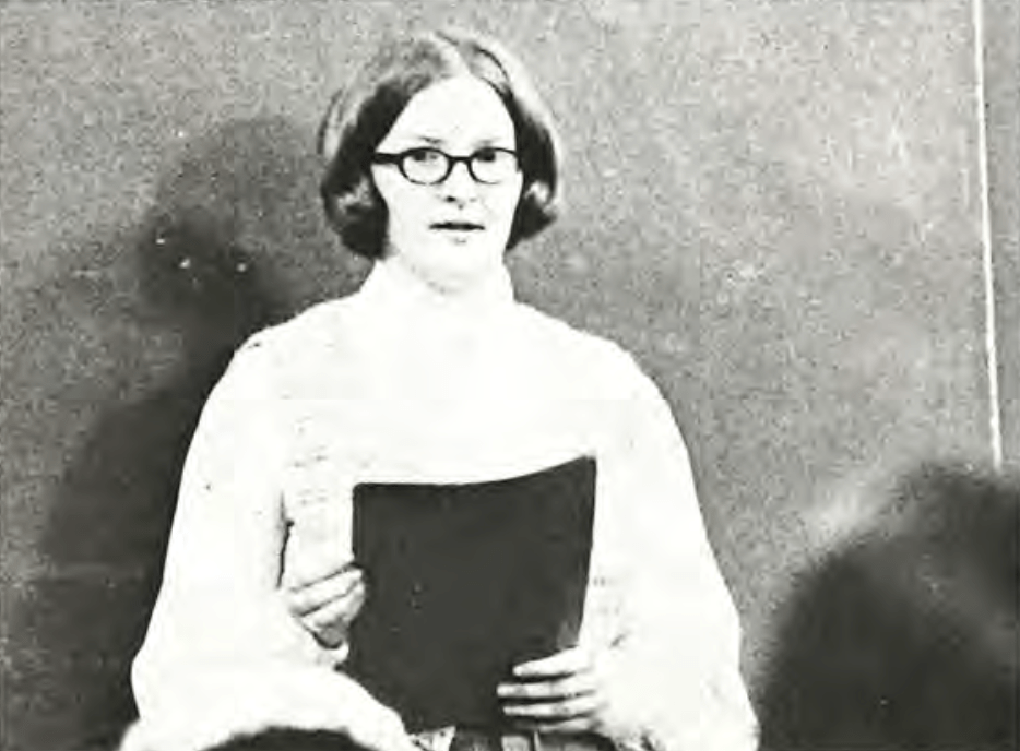 As a Bethel College student, Carol Shimmin majored in Christianity, minored in Speech, and competed in forensics tournaments. In this 1970 Clarion photo, she’s delivering a rhetorical analysis of a speech by Malcolm X.