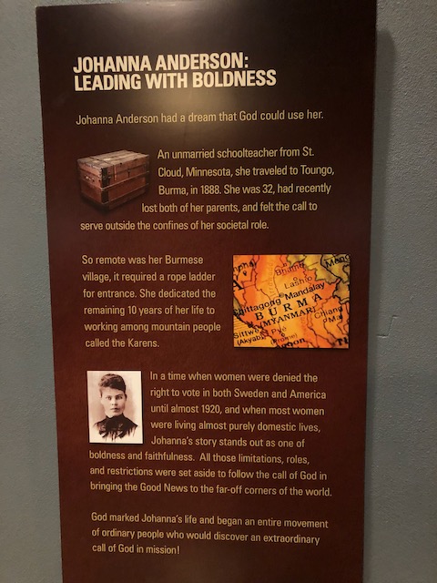 The History Center also includes a historical display area in what used to be the second floor of the Seminary Library. One panel tells the story of the first Swedish-American Baptist missionary, a schoolteacher from Minnesota named Johanna Anderson (mentioned in my earlier post on women in Adolf Olson’s Centenary History of Bethel’s denomination).