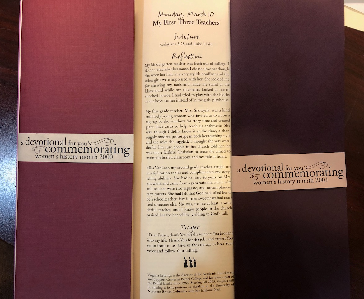 First proposed at a planning meeting in the fall of 1999, three WHM devotionals from the series are held in the Women’s History Month file in Bethel’s archives: 2000, 2001, and 2003. (If there were others, please let me know in the comment section below.) “It was really well done,” recalled student development dean Barb Martin when we interviewed her this past summer, “because over the month of March, we had thirty different women at Bethel who wrote a devotional, one for every day. And that was really well received, I think. Kind of a keepsake, you know, for people.”