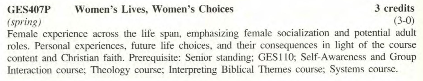 Other courses became regular curricular offerings. From its launch, the new Nursing program not only brought many more women into the faculty and student body but included an upper-level course on Nursing Care with Childbearing and Childrearing Families that paid particular attention to the experiences of mothers. Until a recent modification to the general education curriculum, the Biblical and Theological Studies department offered an exegesis course on Female and Male in Biblical Perspective that first appeared in the 1990-91 catalog.