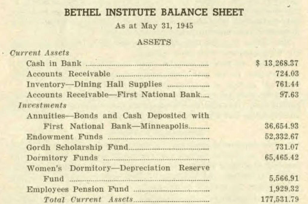 As World War II ended in Europe, Bethel Institute completed its financial report to its denomination, the (no longer Swedish) Baptist General Conference. For the first time, Bethel’s balance sheet included an “Employees Pension Fund” — all $1,929.32 of it.