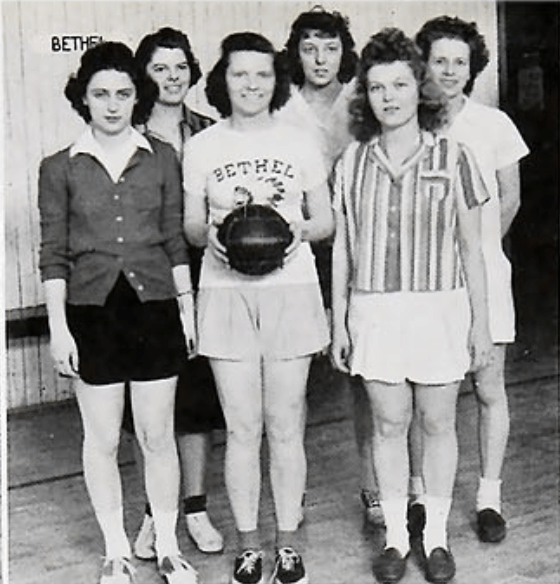 Bethel Academy had had intramural girls’ basketball teams since at least 1916, but it wasn’t until 1923 that the yearbook recorded any competition with another schools (two losses to Minnehaha Academy). In 1936-37, the first year Bethel Institute included the Junior College but not the recently closed Academy, that team comprised the only women depicted on the Depression-shortened yearbook’s two athletics pages, which showed men playing baseball, basketball, golf, horseshoes, and tennis.