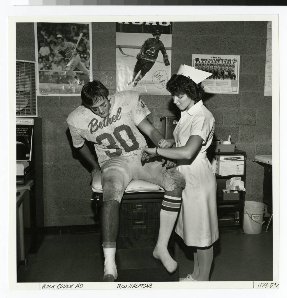 But even as such professors offered their primarily female students new models of Christian women pursuing careers, Bethel struggled early on to know how to publicize their program. Edman recalled that Florence (Oman) Johnson, by then the school’s publications director, asked for feedback on a Nursing Department brochure. “We are not hooking up our students with football players,” Edman told her, after being shown a photo of a nursing major taking the blood pressure of one such student-athlete (below-left). Instead, she remembered the final brochure featuring “a mom and two kids, a toddler and maybe a five-year-old, and a nurse reading something to them in instructions.”27