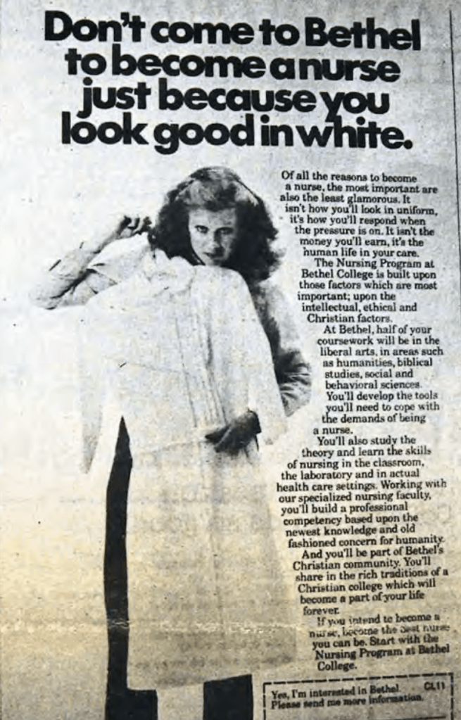 Johnson also received pushback for an advertisement placed in the November 1982 issue of Campus Life magazine (above-right). “Don’t come to Bethel to become a nurse just because you look good in white,” read the headline. “Of all the reasons to become a nurse, the most important are the least glamorous.” Although the ad emphasized learning outcomes and ethical responsibility, nursing students complained in a front-page Clarion story that its image of a blonde woman holding a white uniform was “stereotypical” and “sexist” — just “a small example” of how “sexism is rampant at Bethel,” wrote in another student.28